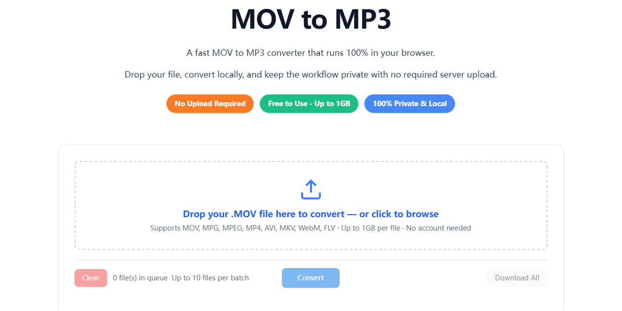 This service is a browser-based video to MP3 converter. The current workflow is designed for common input formats such as MOV, MPG, MPEG, MP4, AVI, MKV, WebM, and FLV, with a current product limit of up to 1GB per file in the main experience.